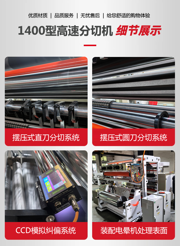 1400D4-2型电脑控制高速LETOU.COM,宽幅1400mm,分切速度350m/min,采用CCD模拟纠偏系统,分切12u-50um卷筒类镭射膜、镀铝膜、冷烫膜、电化品等塑料薄膜,配备摆压式直刀和圆刀分切系统,分切多种规格,具有自动化程度高,生产效率高,产品精度高,无划伤等优点。是一台国内水平的分切专用设备。